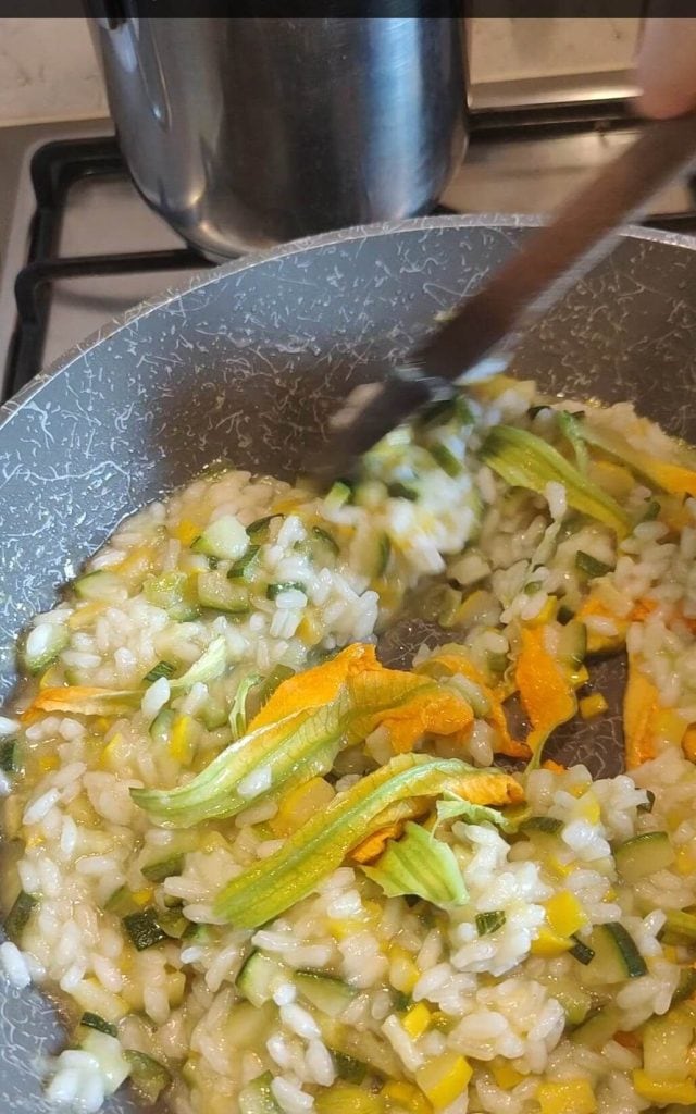 Here is today’s recipe: risotto with zucchini flowers and zucchini, truly good, delicate, very light, and healthy.