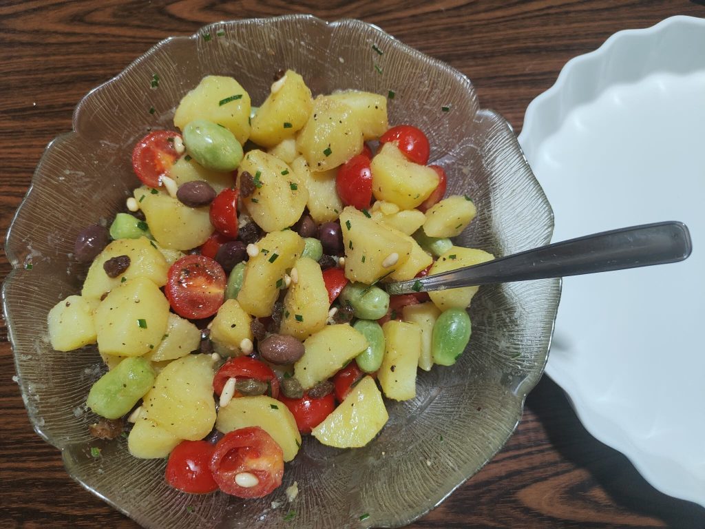 • In a large bowl, combine the blanched potatoes, halved cherry tomatoes, desalted capers, olives, soaked and squeezed raisins, and most of the pine nuts.