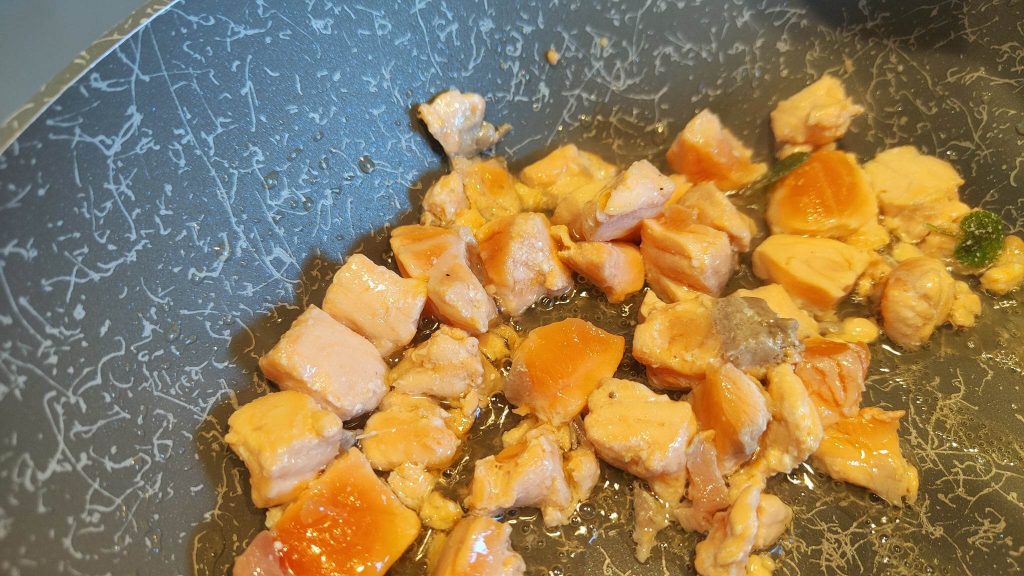 • After cleaning the salmon well, cut it with a knife and set it aside.