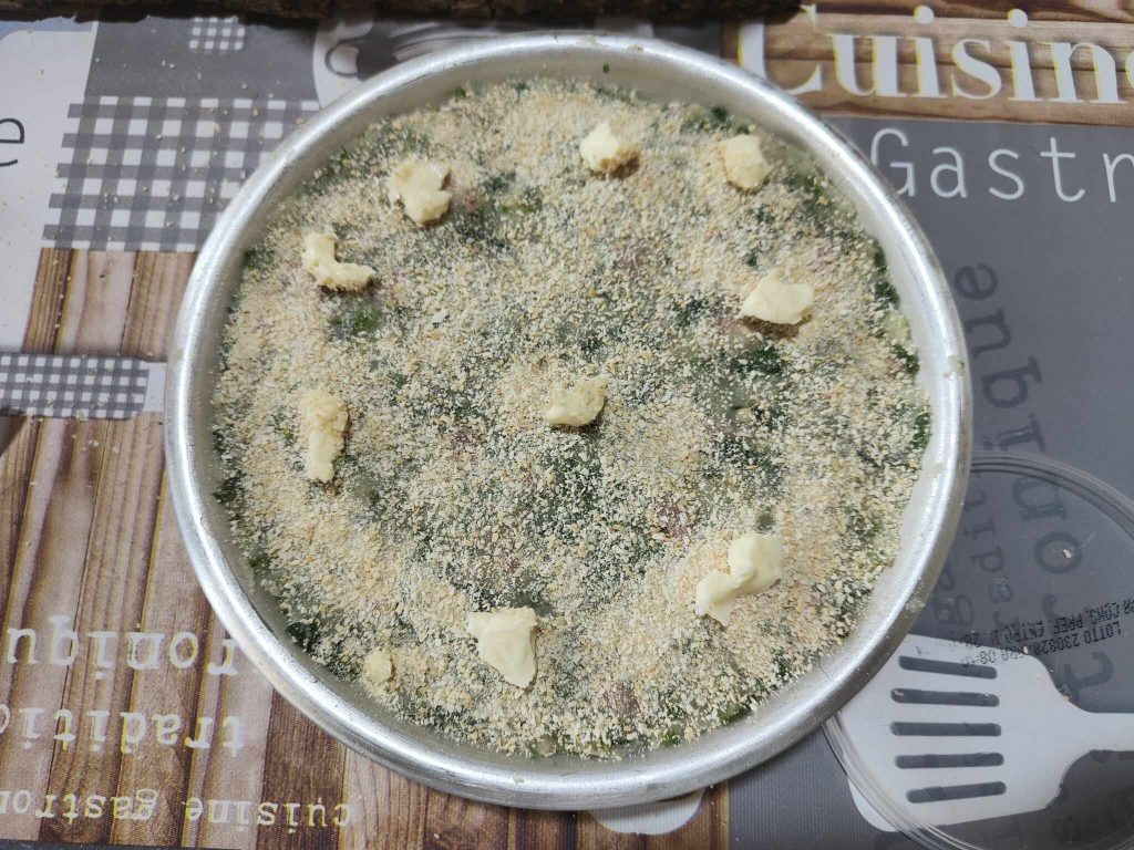 Once the pan is filled, add a second dusting of breadcrumbs with a few knobs of butter before baking.