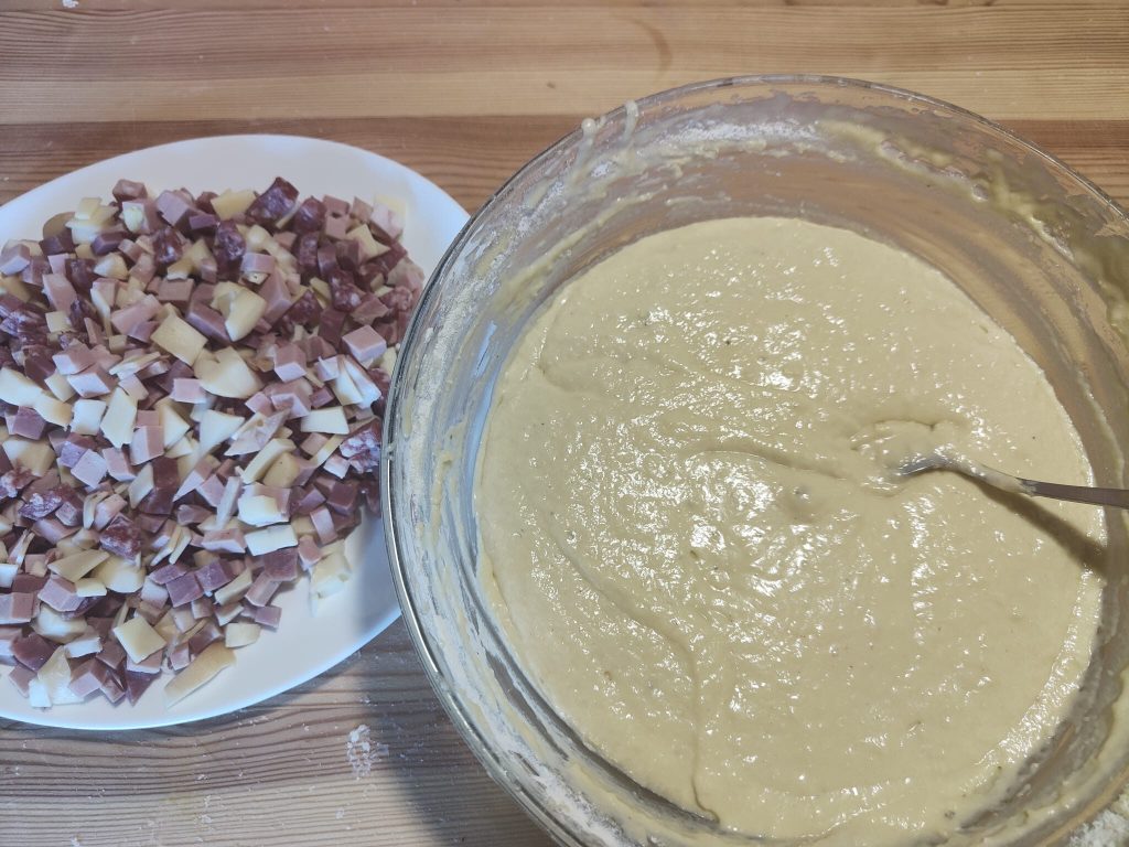 • When you have obtained a homogeneous dough, add the cheeses and cured meats.