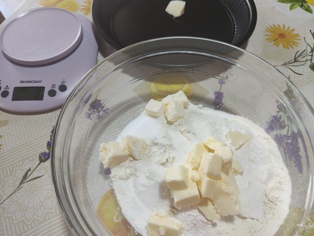 • Add the cold butter cut into pieces, the egg yolk, and the grated lemon zest. Work everything quickly with your hands (or fingertips), rubbing the ingredients until you get a completely crumbled and grainy dough.