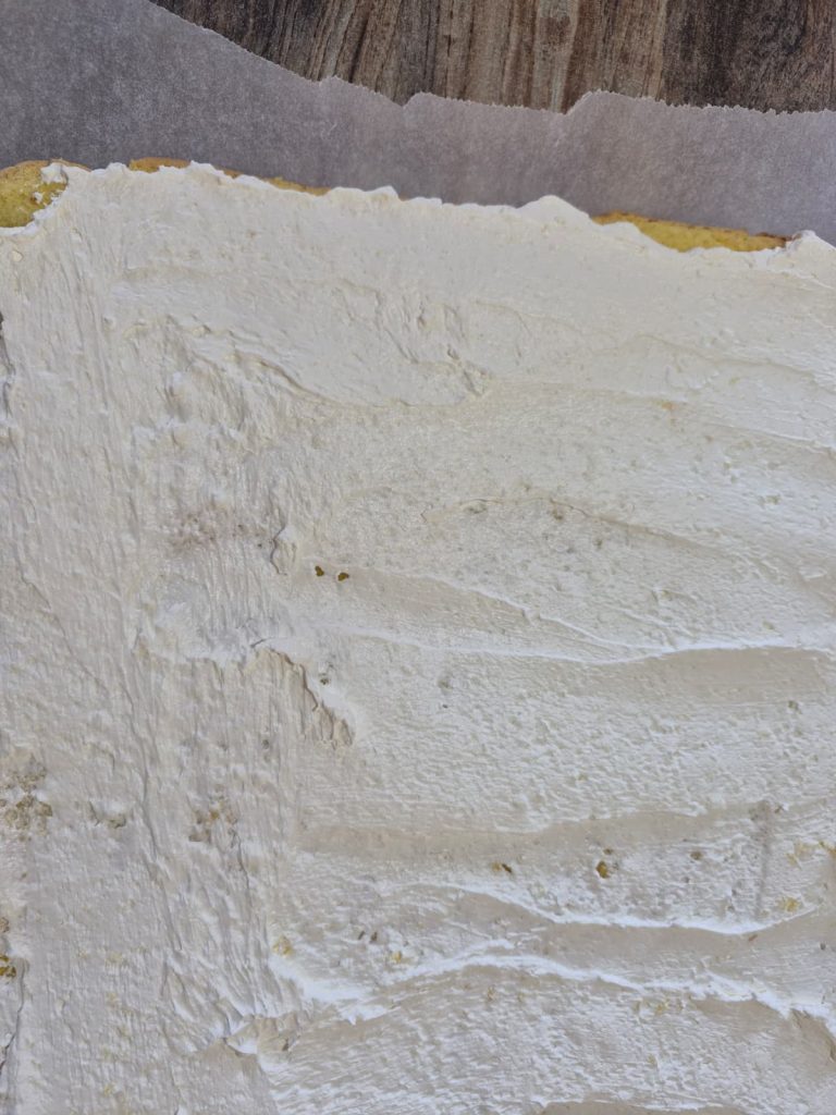 Keep about 3-4 tbsp of cream in a small covered bowl in the fridge (you’ll need it for the outside decoration).Carefully unroll the now-cooled sponge. Brush the entire surface with the rum syrup (made with water, sugar and rum).