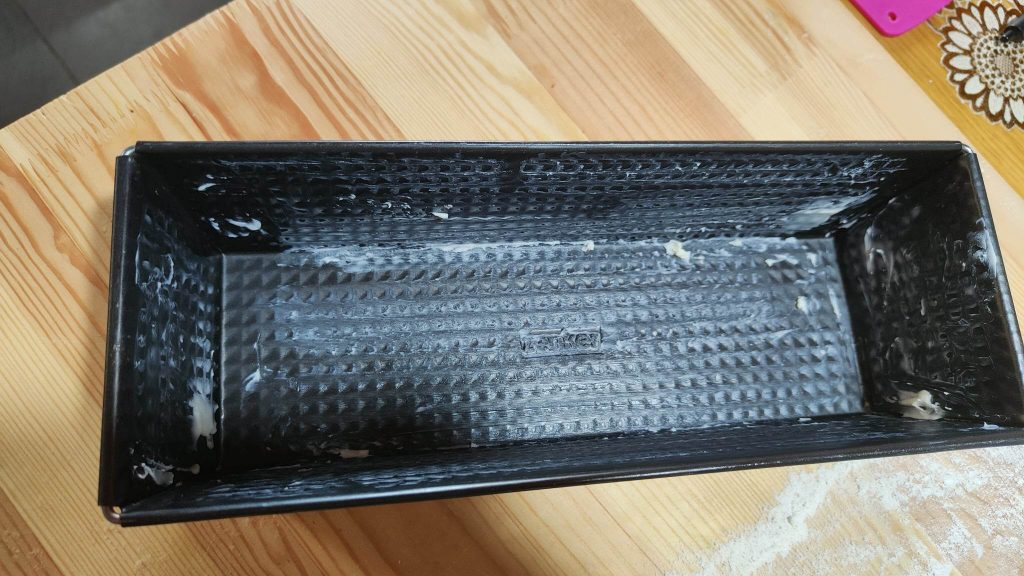 • Place it inside the greased loaf pan with butter (or with wet and wrung baking paper).