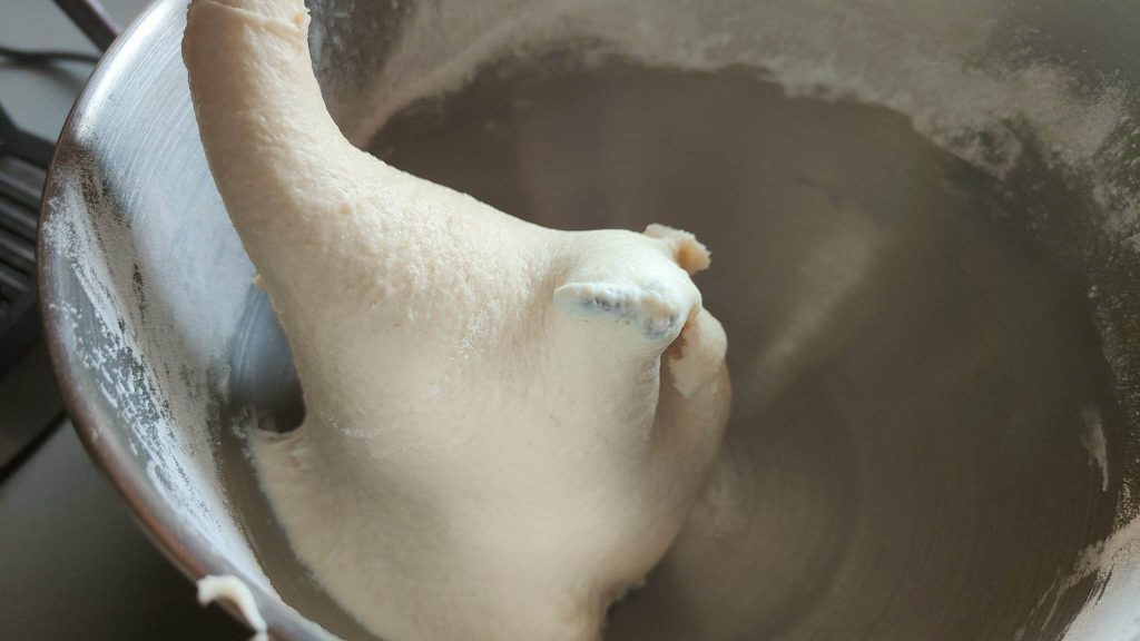 • Let the stand mixer work gently (alternating speeds 2/3) until the dough detaches from the sides as shown in the picture.