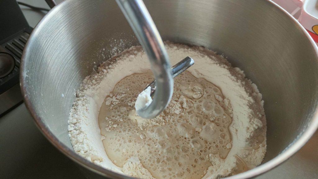Place the flour in the bowl of the stand mixer fitted with the hook, add the sugar and the milk with dissolved yeast.
