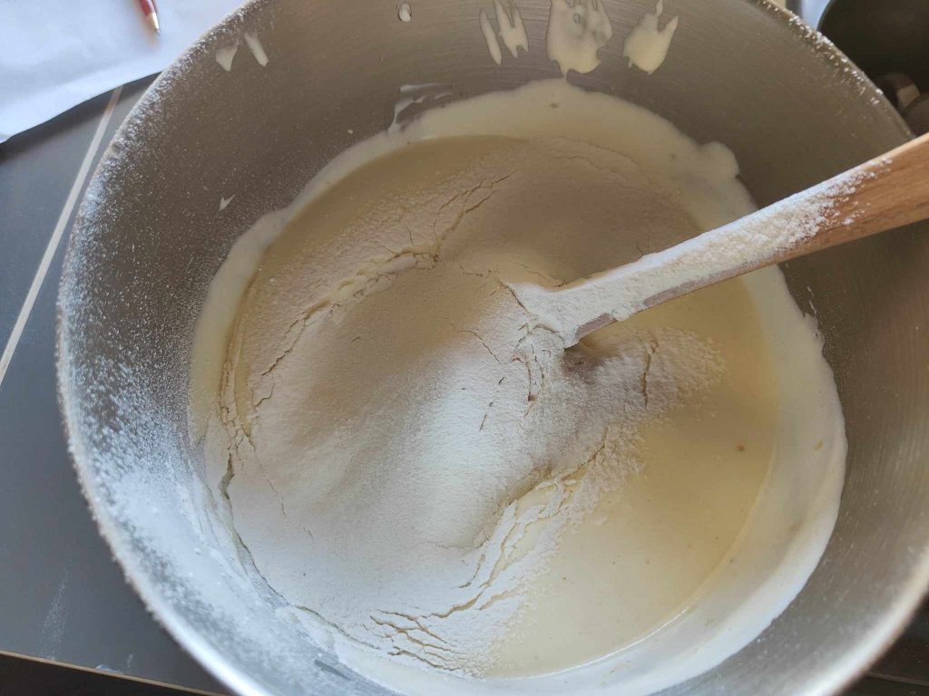Finally, add the sifted powders and baking powder, continuing to mix well with a spatula from bottom to top gently.