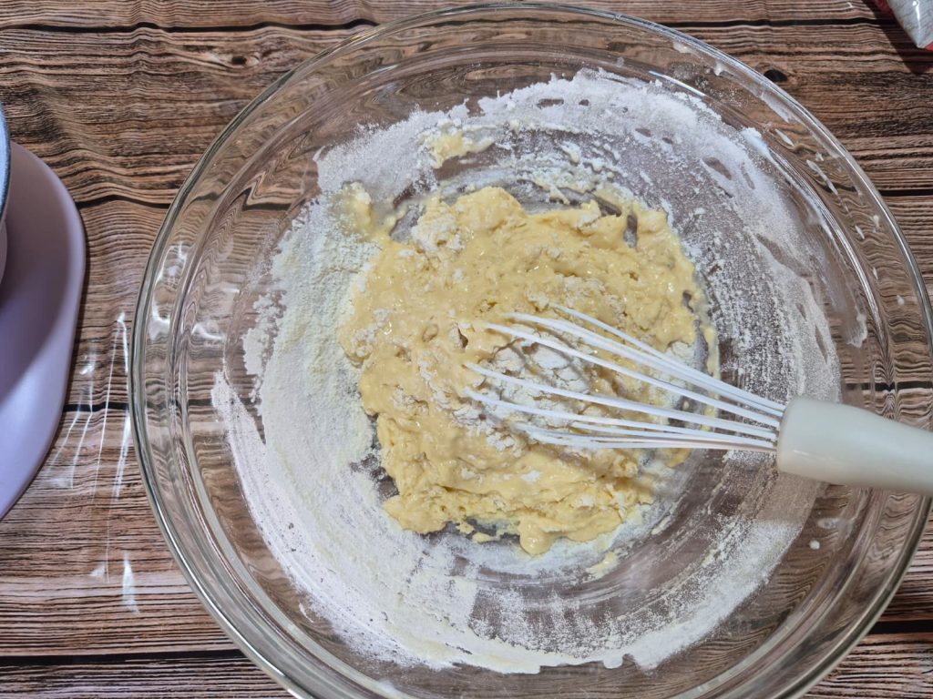 Unlike sweet sponge cakes, here you don’t need to incorporate too much air with electric whisks. Use a hand whisk: the batter should be fluid yet thick, so it won’t produce large surface bubbles and will remain smooth.