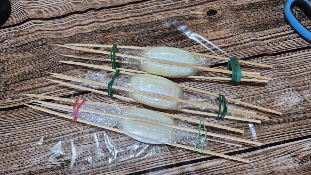 The Thermal Shock: When the time is up, drain them immediately and run them under ice-cold water. This stops cooking instantly, preserves the bright yellow color and helps you peel them more easily to shape them with the skewers.