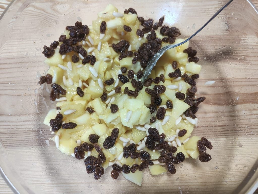 In a bowl, combine the chopped apples, pine nuts, Erythritol (instead of sugar), and the raisins soaked in Rum for perfect aroma.