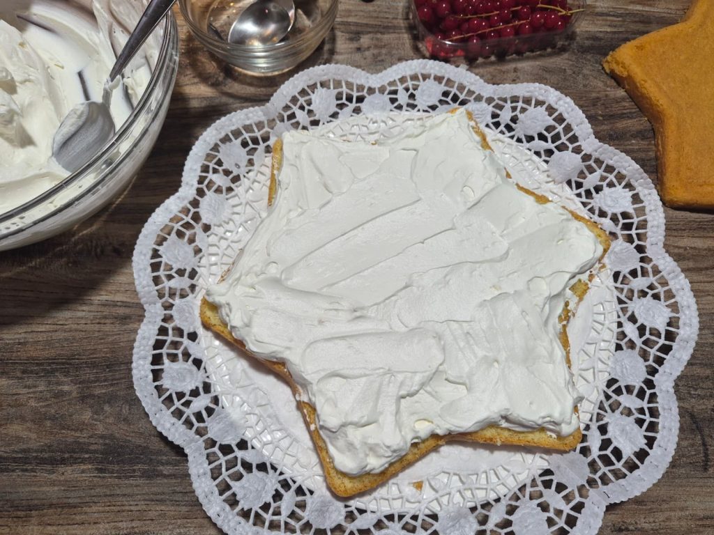 I prepared a soft Sponge Cake baked in a star mold, generously filled with my irresistible Paradise Cream (made with mascarpone, fresh cream, and powdered sugar).