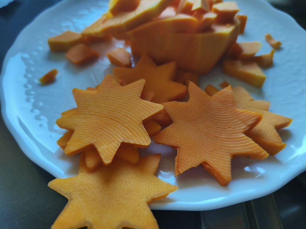 (In the meantime, I peeled a piece of pumpkin, cutting it into thin slices about half a centimeter thick and made stars.