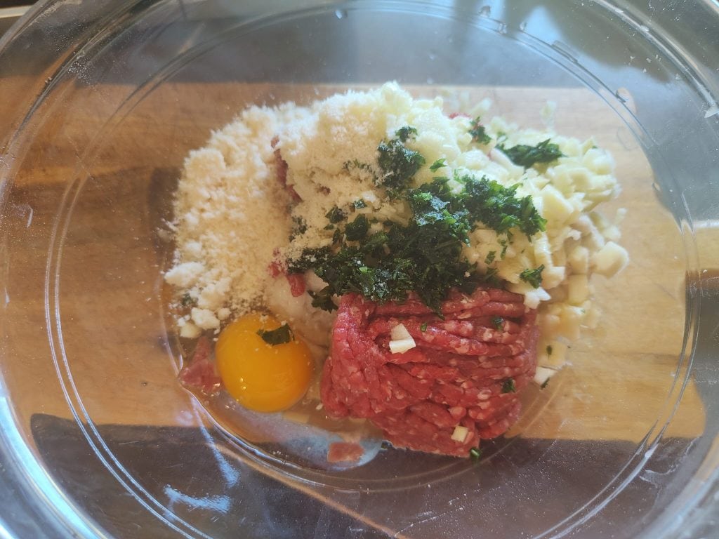 In a bowl, add the meat, the eggs, the parmesan, the salt, the pepper, and the nutmeg.