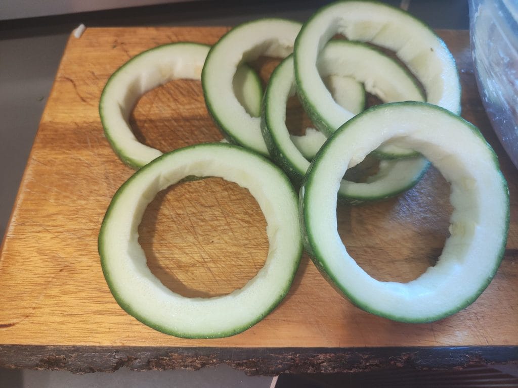 As a first step, wash, dry, and cut the zucchinis into thick slices about 1.5 or 2 inches thick, creating rings