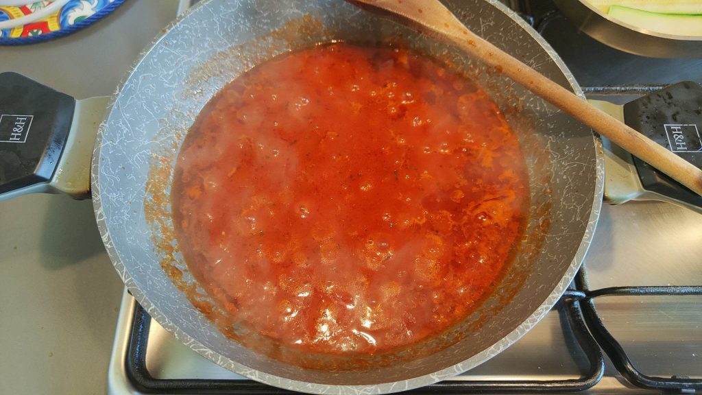 Then add the tomato puree, salt, and some basil leaves, stir and leave on the fire for about 10/15 minutes.