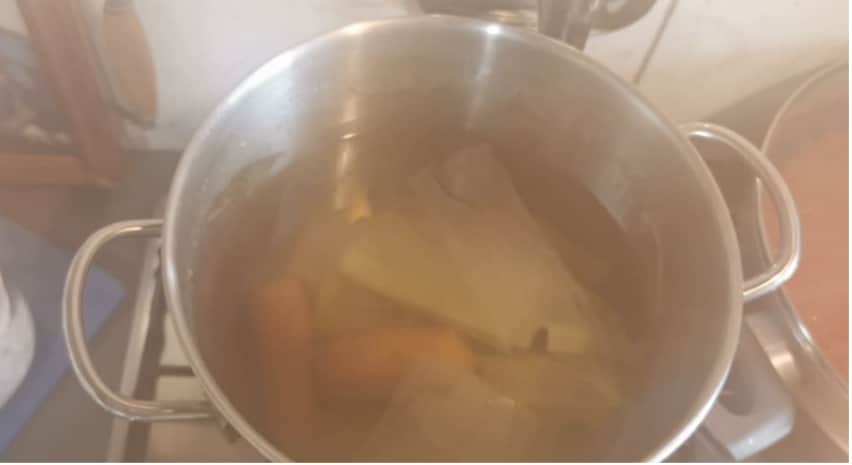 Prepare a quick broth with half an onion, celery, and carrot. “Keep it warm”.