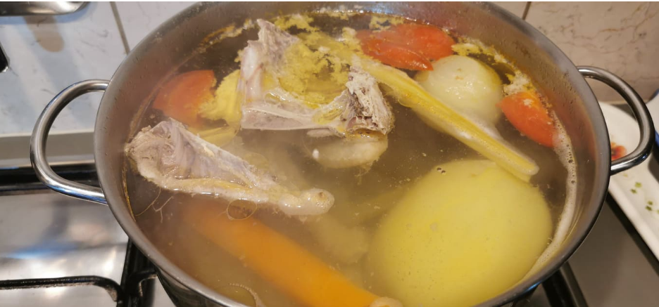 • In a large pot, heat about 3/4 gallons of water, add a white onion, two carrots, a stalk of celery, and a little salt.