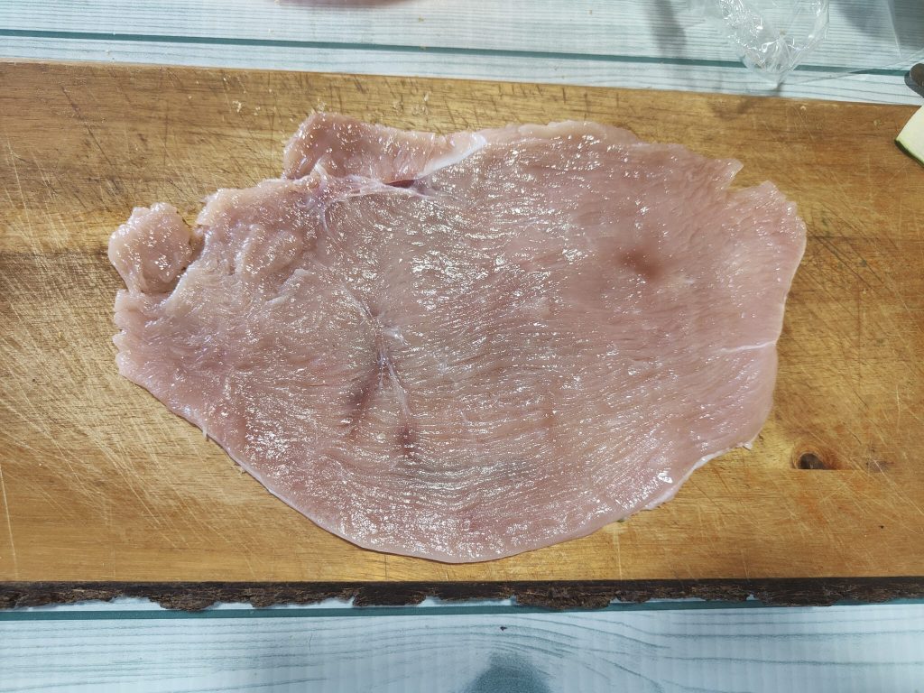 • Lay the turkey breast slices on the cutting board and pound them to make them slightly thinner and tender.