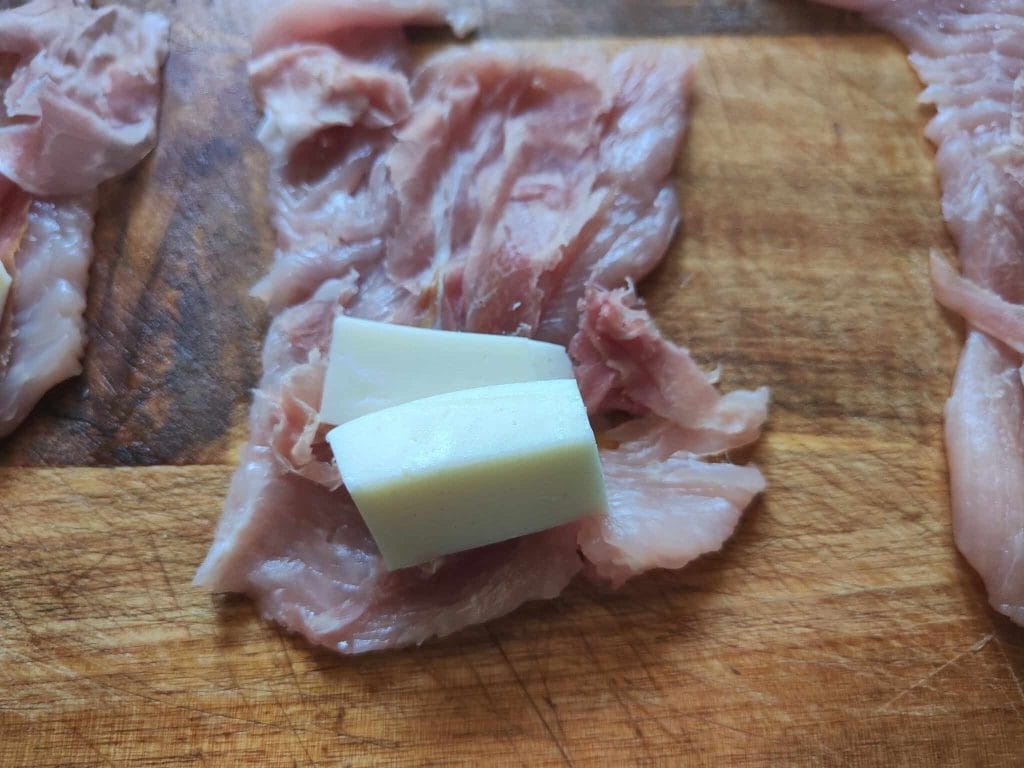 Place a bit of cooked ham and a cheese stick on each turkey slice, roll the meat to form the roll-up, and secure it with toothpicks.