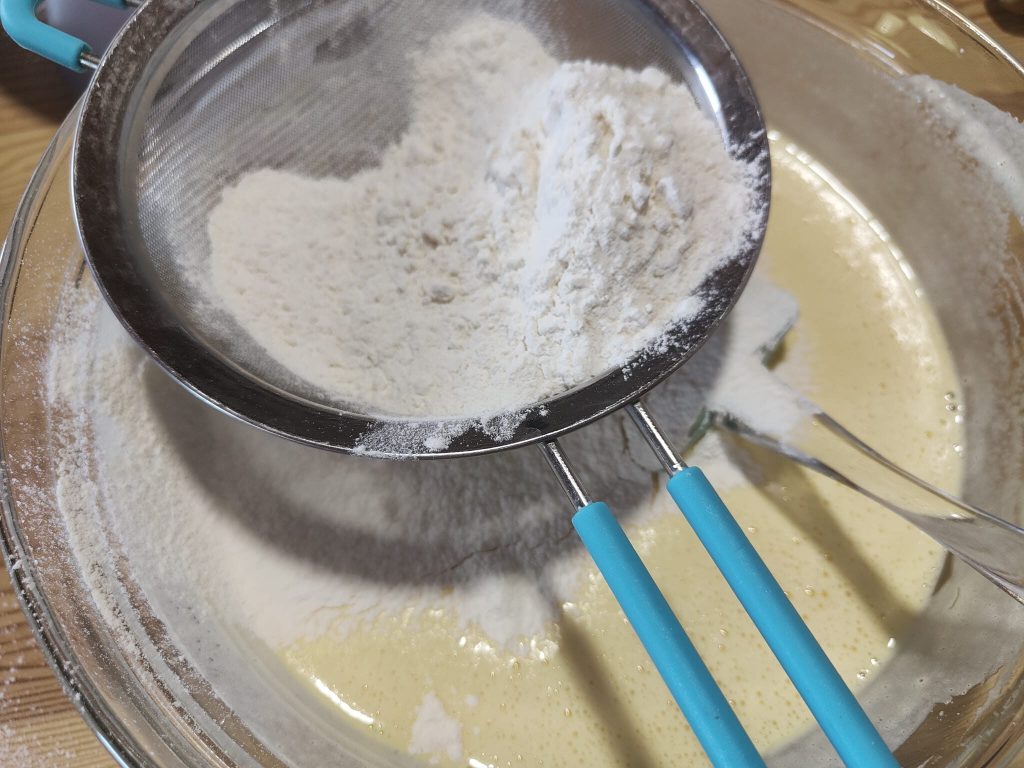 In a large bowl, beat the eggs with the sugar (or erythritol) using electric beaters for at least 10 minutes until they are fluffy, creamy, and lighter in color. Then pour in the sunflower oil (or melted butter) and Greek yogurt, add the sifted flour, and then a pinch of salt.
