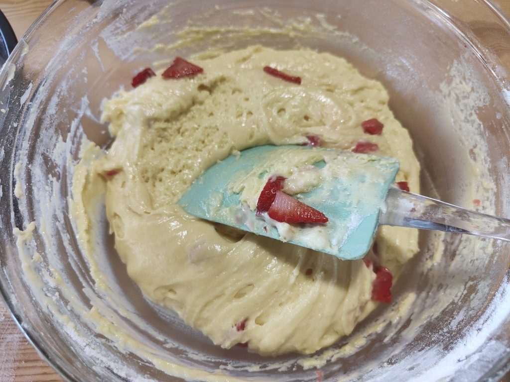 Once the mixture is ready, wash the strawberries well, pat them dry with paper towels to remove excess water, and cut them into cubes. Gently add some of them into the bowl and incorporate them well into the batter with a spatula.
