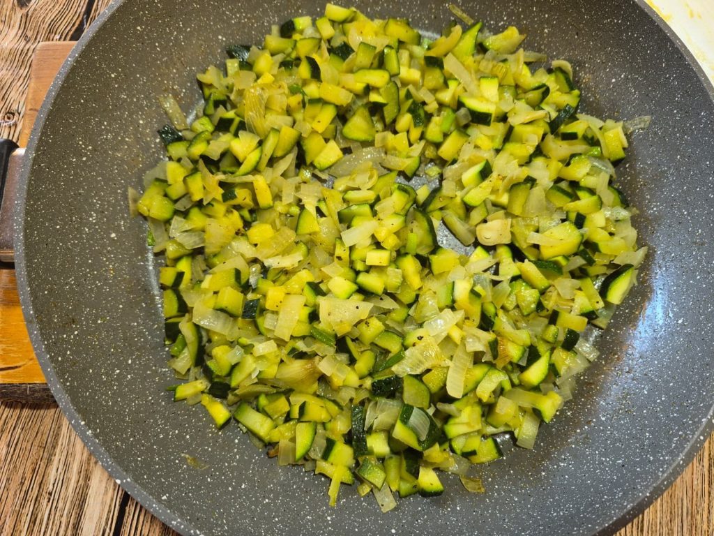 Add the zucchini, cut into rounds or cubes, to the sautéed onion.