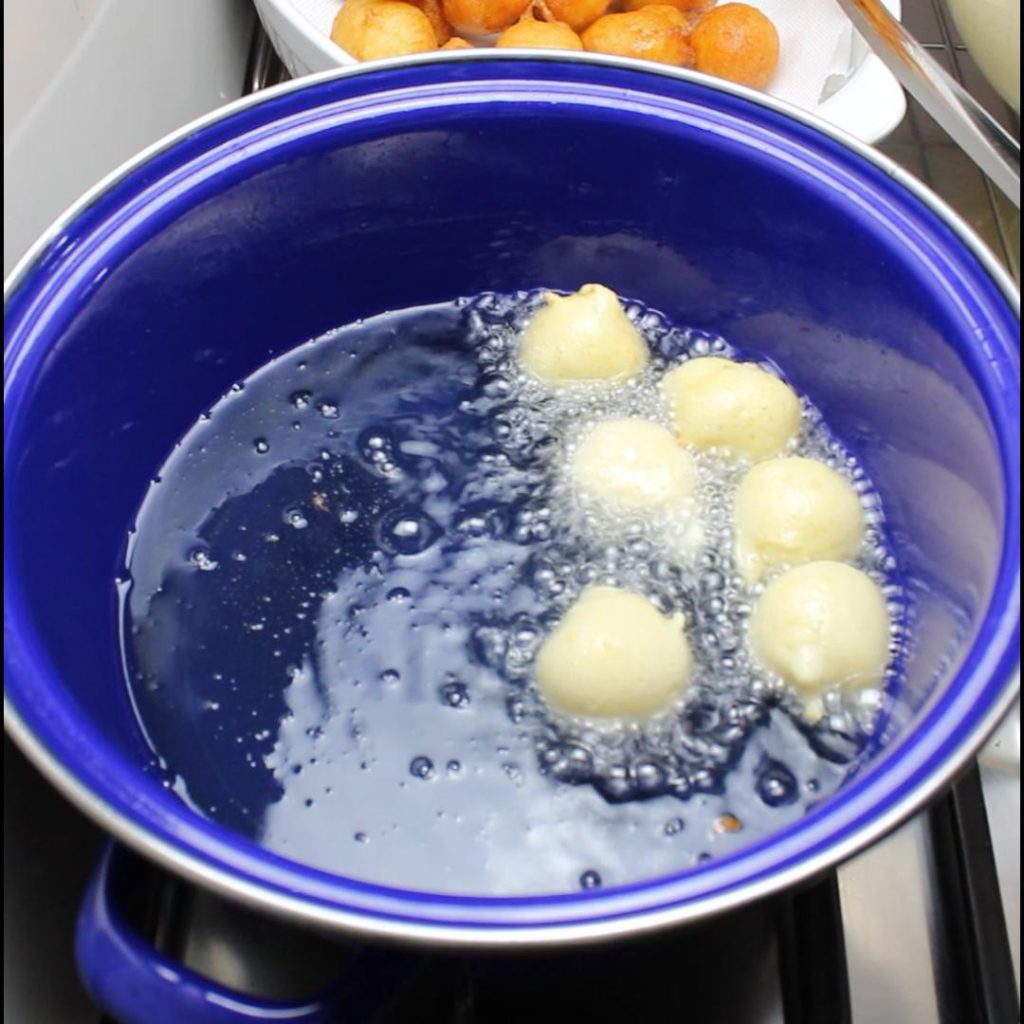Using a spoon, take small amounts of dough and let it fall into the hot oil. If the oil is at the right temperature, the fritters will start frying and will immediately rise to the surface.