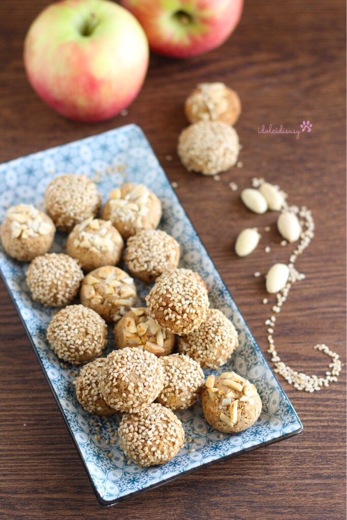 Add the cooked apples to the almond flour and blend everything together, transfer the obtained dough to a bowl and form a homogeneous dough ball. Prepare a small bowl with sesame seeds and, if desired, another with sliced almonds. Take a piece of dough, roll it between your hands to form a nice ball, roll it in the seeds or sliced almonds, and place it on a baking sheet lined with parchment paper or the perforated mat.