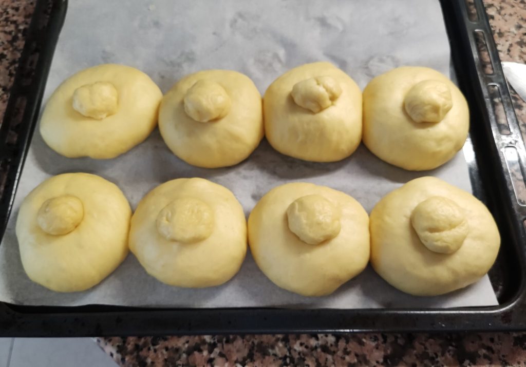From the risen dough, I make eight large balls of 80 g and 8 smaller ones of 10 g. I place them on a baking sheet covered with parchment paper, press in the center of the large ball with a finger and slightly push the small one (the tuppo), and let them rise for a couple of hours.