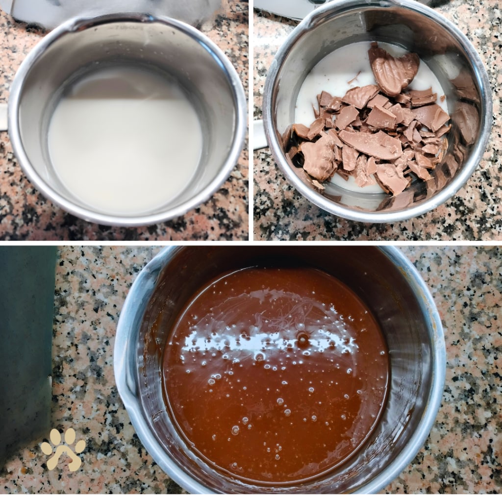 In a saucepan, heat the hazelnut milk until it almost reaches a boil, turn off the heat and add the broken chocolate. Stir and let it melt well. The cream is ready; set it aside to cool while you prepare the pastry.