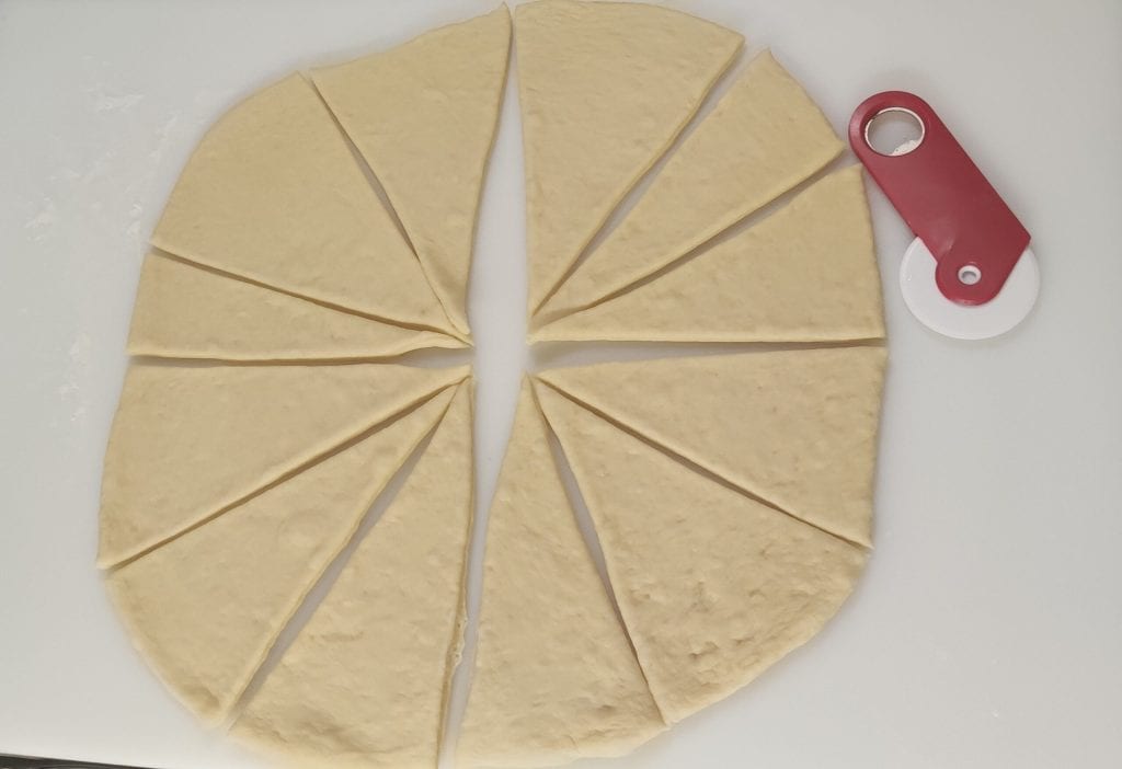 6. Roll out the dough into a disk, cut it into wedges, and roll like croissants.