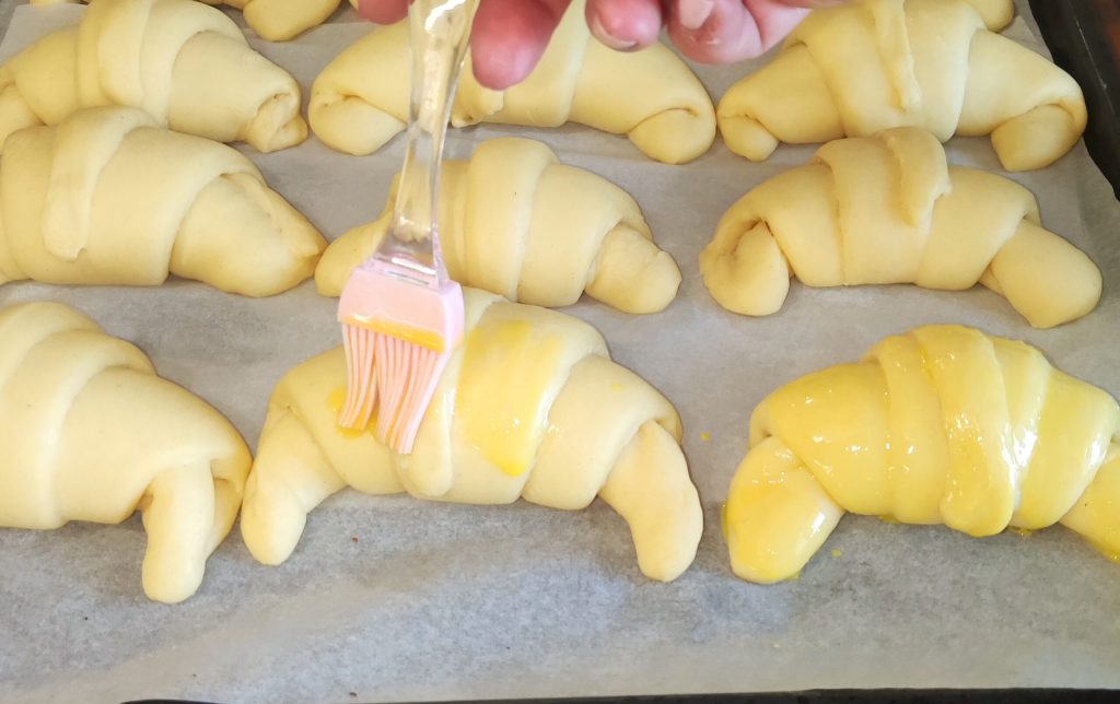 After rising, I roll out the dough on the work surface with a rolling pin into a circle, using the pastry wheel I create 12 triangles. On the largest side, I put a teaspoon of Nutella and roll up the dough to create the classic brioche shape.