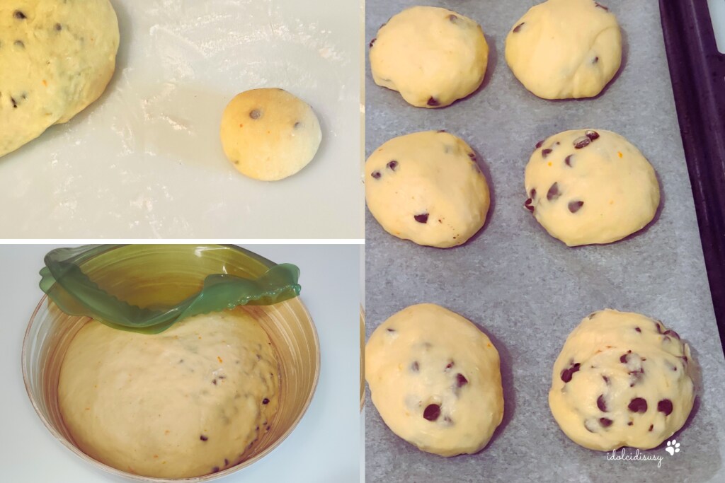 The dough has risen well, turn it out onto the work surface, and cut pieces of dough weighing about 60 g (approximately 2 oz) each to form the buns. Place the formed buns on a baking sheet lined with parchment paper, well spaced apart, and let rise until doubled.