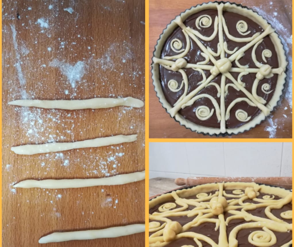 In a bowl, I put all the ingredients and start kneading to create a homogeneous dough. I wrap the shortcrust pastry in parchment paper and let it rest in the fridge for at least a couple of hours. After the resting time, I roll it out on the pastry board, place it on an 11-inch pan, pour the hazelnut cream, and start creating the web and Mr. Spider.