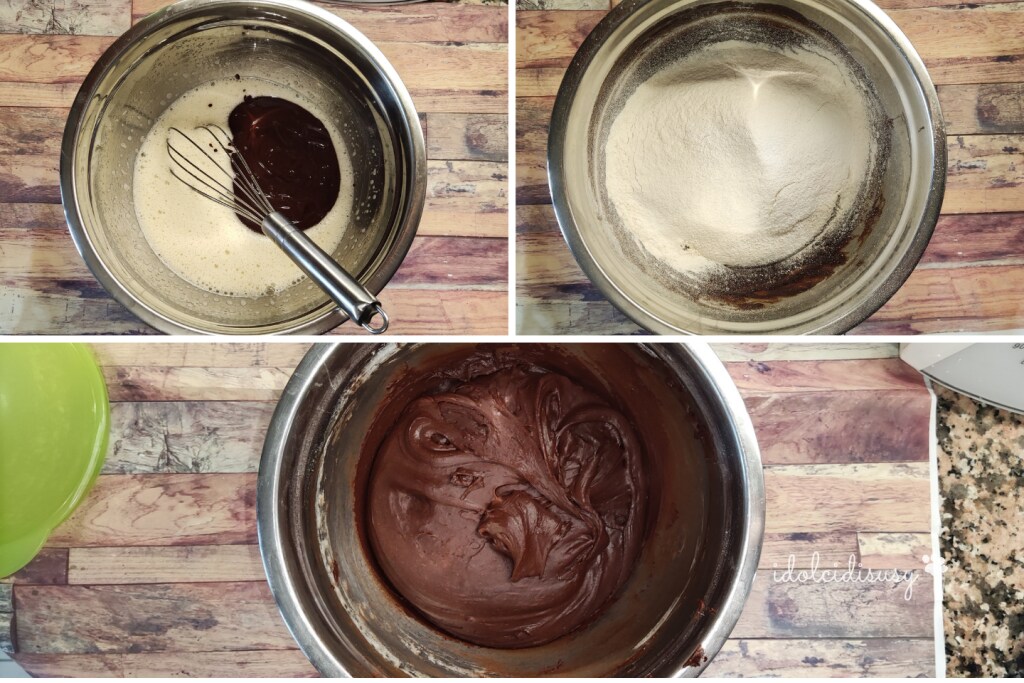 Add the dark chocolate to the egg bowl and continue whisking by hand. Then, incorporate the sifted flour and baking powder, mix with a pastry spatula, and cover the bowl with plastic wrap in the fridge for an hour. This step is crucial to make the dough compact and homogenous.