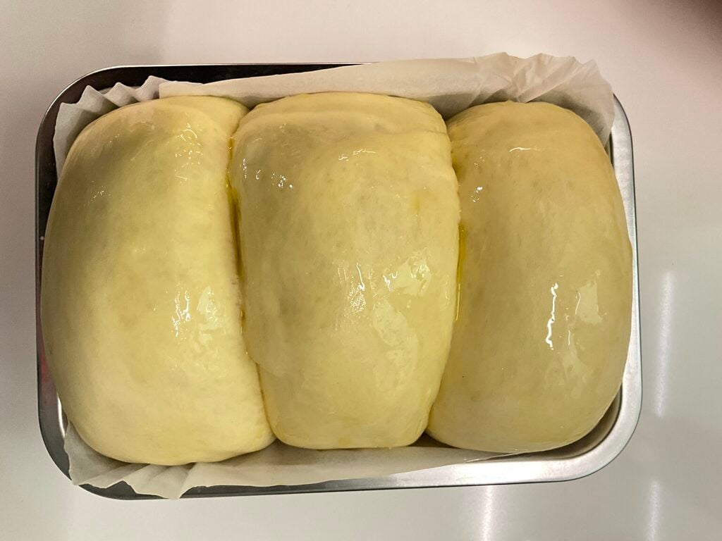 After 15 minutes, gather all the dough in the bowl using a spatula. You’ll notice it’s very soft and warm. Grease your hands with oil to prevent sticking. Now you can divide it into three equal parts, fold and form three balls. Arrange them horizontally to fill the mold.