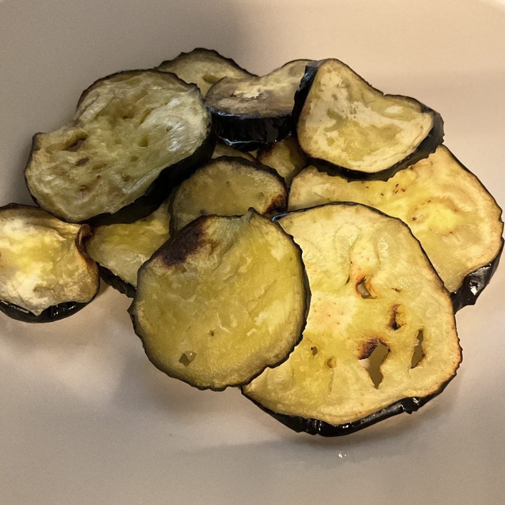 Place the eggplant slices on the air fryer rack, without overlapping them. Cook using the veggies mode, i.e., at 383°F, for 6 minutes. Using a fork or better yet a kitchen tongs, flip them to the other side and continue cooking for another 6 minutes. It will take 5 or 6 rounds of cooking for 2.2 lbs of eggplants. Be mindful that after the first few cookings, since the air fryer is at temperature, it might take a few minutes less. Check, especially the second cooking after 3 or 4 minutes.