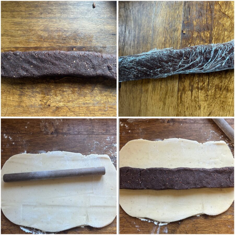 Form a homogeneous loaf. Then roll it into a cylinder and flatten it slightly, wrap it in plastic wrap and refrigerate for 20 minutes.