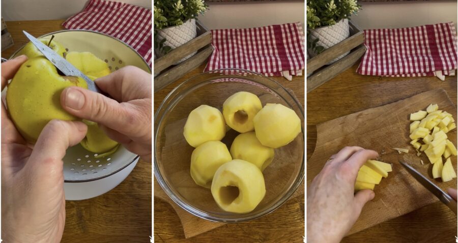 To make this delicious apple tart, start with the filling: rinse the apples, peel them, remove the cores and cut them into very small pieces. (Take the butter for the pastry out of the fridge so it softens)