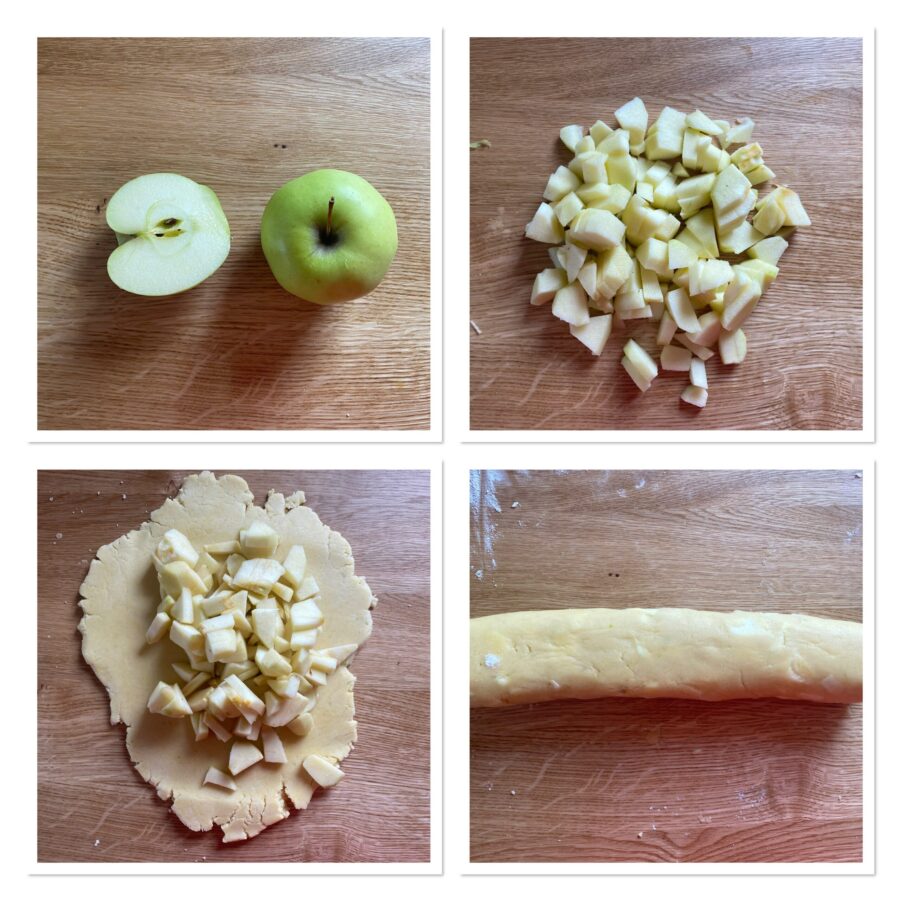 • Rinse the apples, peel them and cut them into small cubes. Roll out the dough, distribute the apples over it and incorporate them; because the apples will soften and make the dough sticky as they warm, add about 1/3 cup of flour (about 50 g) to adjust the consistency. Shape the dough into a log, wrap it in cling film and place it in the freezer for 30 minutes.