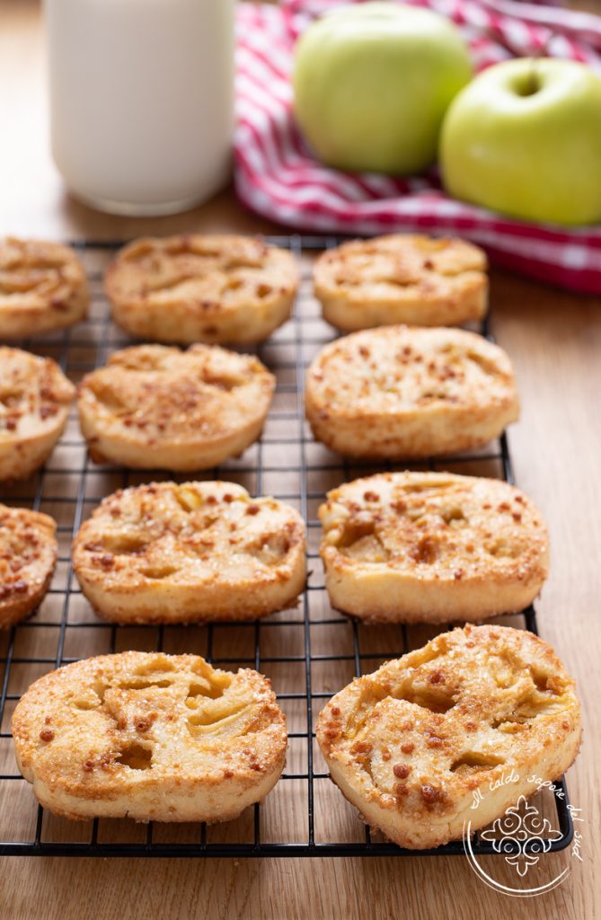 Apple cookies, the grandma’s recipe to make apple cookies with shortcrust pastry that are crumbly and with lots of little fruit pieces, a very easy recipe. Here is grandma’s recipe for cookies that are crunchy on the outside and soft inside, which recall childhood and bring us back to the wholesome snacks of when we were children. The shortbread cookies with pieces of apple are perfect for anyone who wants to treat themselves with a cookie in front of a cup of tea or warm milk, perhaps when it’s raining and cold outside. Making these apple shortbread cookies is very simple: just enrich a delicate crumbly shortcrust pastry with lots of diced apple pieces, and once the cookies are formed, a final dip in raw cane sugar will create a pleasant crunchy sugar crust that will make them perfect! Are you ready to go to the kitchen, get your hands in the dough and prepare the apple-piece cookie recipe with me? Let’s go, but first I remind you that if you want to stay updated on new recipes you can follow my Facebook page and my Instagram profile.
