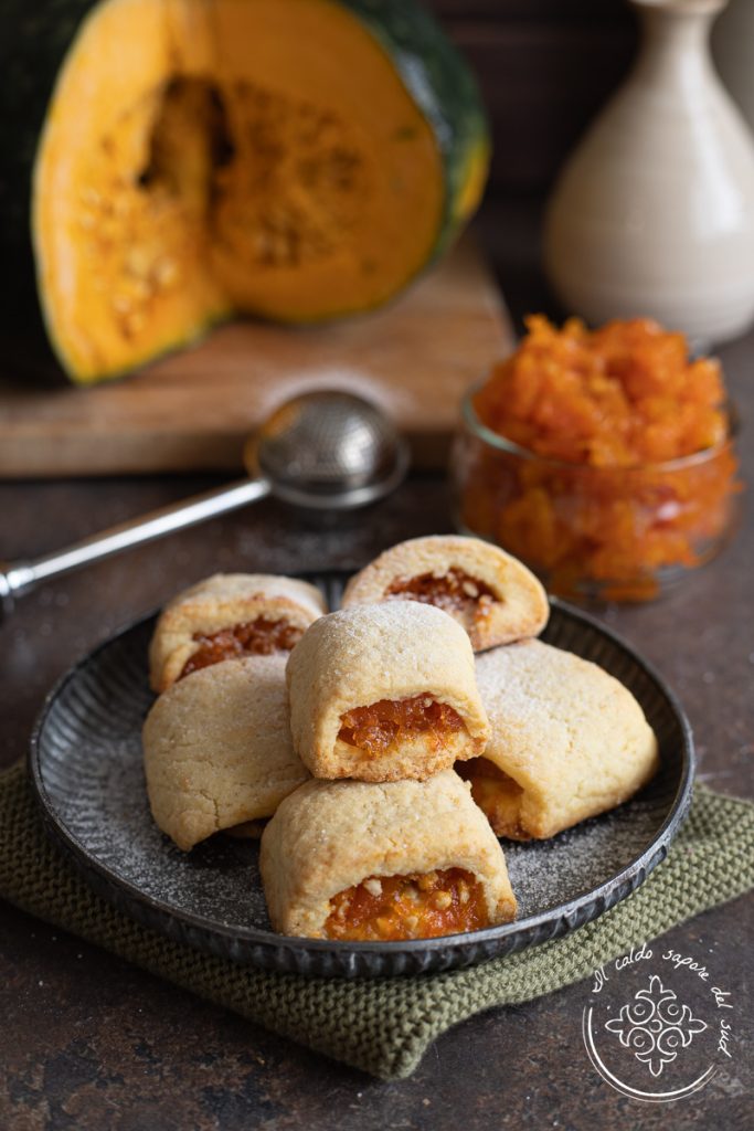 Autumn cookies filled with pumpkin jam. Served with a cup of milk or tea, these fragrant cookies with a soft center are just what you need to start the day off right with a healthy breakfast. Together with the pumpkin and almond tart, fig cookies and apple cookies, the cookies filled with pumpkin jam make a delightful and tempting autumn breakfast, perfect for warming hearts on chilly October and November mornings — not to mention these treats are part of our collection of many delicious cookie recipes. I wasn’t surprised when tasting these cookies to realize how well pumpkin jam pairs with the crumbly shortcrust pastry. Pumpkin, with its thousand recipes, once again proves to be one of the most delicious and versatile vegetables in the kitchen, perfect also for creating always-different desserts!