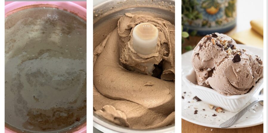 Typically the churning time for a cold base is 35–40 minutes; depending on the size of your machine, proceed by dividing the mixture in two and churning one half first, then the other.