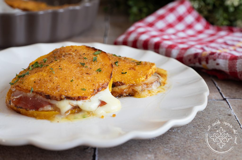 Pumpkin medallions with speck and cheese, baked in the oven — a quick and tasty autumn recipe for a very easy, economical and flavorful main course and an original appetizer. If you love pumpkin recipes but don’t have any inspiration and don’t know how to cook it, this is the quick and tasty dish that will save your dinner. The slices of pumpkin about 0.2 in (1/5 in) thick are baked for a few minutes, then filled with speck and cheese (provola, caciotta, scamorza…) and then left to brown a bit more in the oven. These medallions, as good as the famous Baked Pumpkin Cutlets, are prepared in no time, are very easy to make and can also be cooked in an air fryer. Let’s head to the kitchen now, but first I remind you that if you want to stay updated on all my recipes, you can follow my Facebook page (here) and my Instagram profile (here).