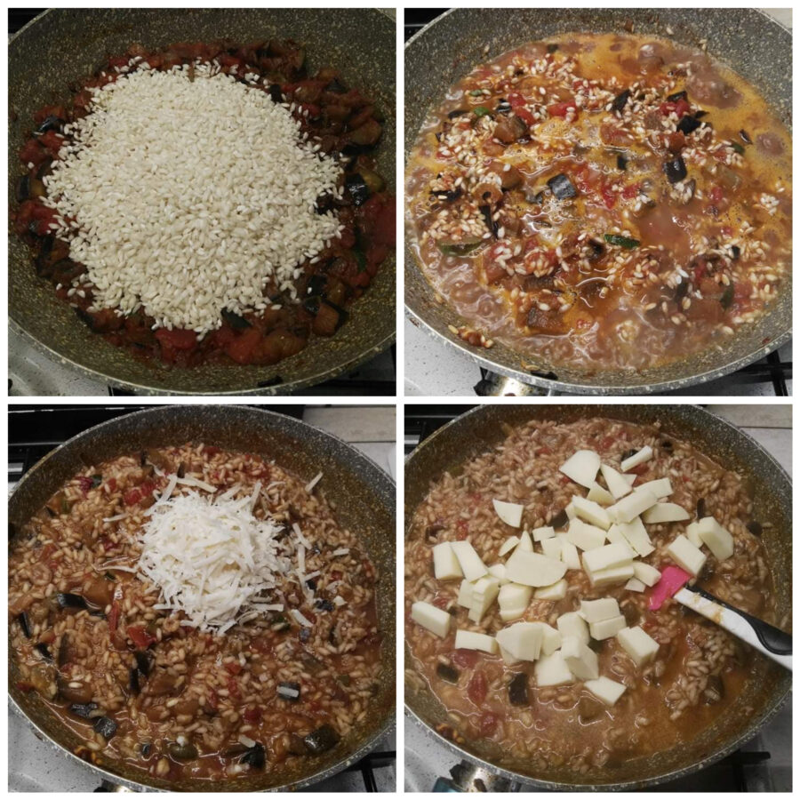 To make the baked rice with eggplant, peel the onion, chop it and sauté it in plenty of olive oil. Add the eggplants (washed, stem removed and cut into very small dice), season with salt and let them soften over medium heat, stirring often.