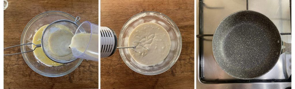 • Gradually add the butter, milk and banana mixture to the bowl with the dry ingredients, making sure not to form lumps (to make the batter even smoother you can pass the liquid mixture through a fine sieve). Place a lightly oiled pan on the stove and once hot, but not smoking, pour the first ladle of batter.