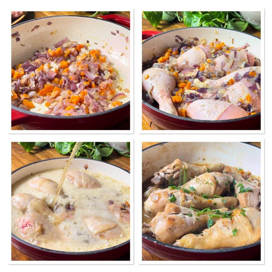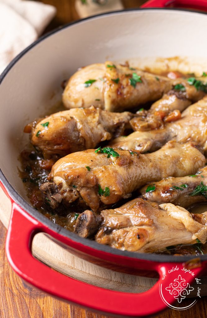 Beer chicken drumsticks in a skillet, very tender and succulent — the perfect recipe if you don’t know How to cook chicken. With chicken you can easily create tasty and relatively inexpensive dishes; this type of meat indeed allows for a thousand different combinations and delightful results. On the blog there are many chicken-based recipes, but I managed to find one I hadn’t made yet: beer chicken drumsticks. I can say that until some time ago I was very reluctant to use this beverage when preparing meat mains, then one day I decided to try and risked cooking beer pork loin rolls, beer meatballs and even beer-braised pork ribs or beer-braised pork neck. Believe me, they were so good that then I got creative and with the same beverage I also prepared beer-braised pork shank cooked in a pot, beer-braised chicken in a casserole and many other recipes like today’s, where beer is a key ingredient! But let’s go to the kitchen — I’ll tell you how easy it is to cook beer chicken drumsticks in a skillet with onions and carrots, making even a little sauce for dipping at the end! Before running to the stove, remember that if you want to stay updated on my recipes you can follow my Facebook page (here) and my Instagram profile (here).