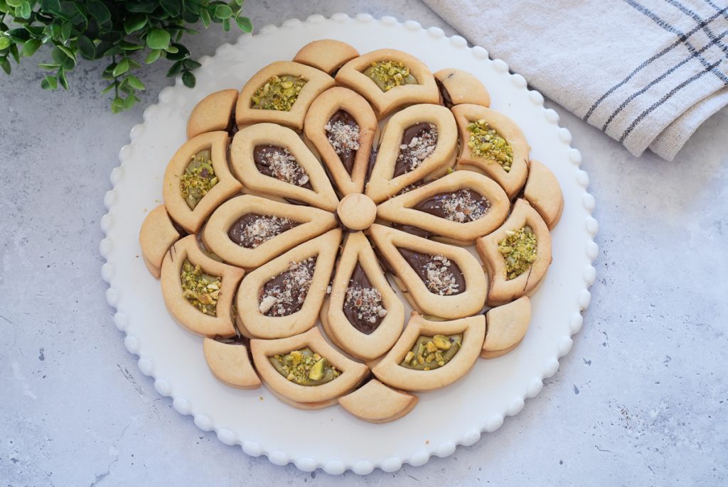 Once they are lukewarm you can assemble the pairs, filling the whole base with pistachio or hazelnut spread or with jam or preserves and placing the part with the hole on top.
