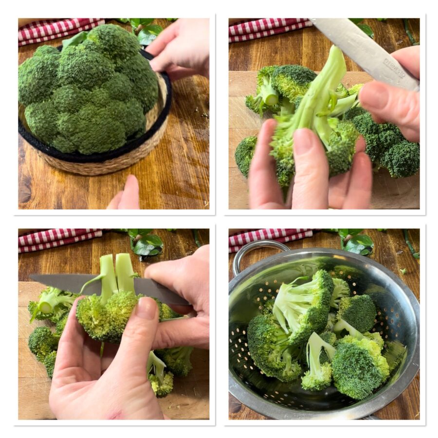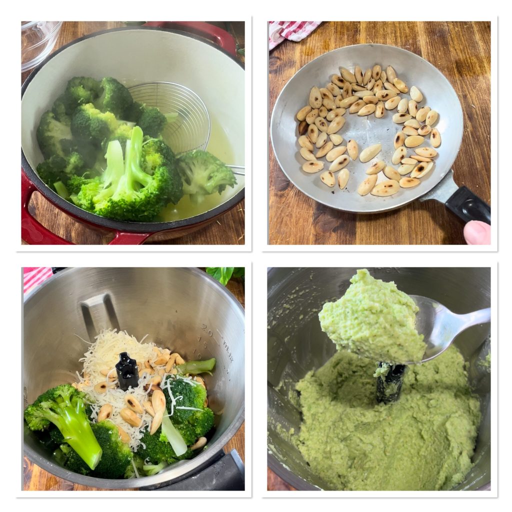 To make the broccoli and almond pesto, start by bringing a pot full of water to a boil. Then separate the broccoli florets from each other, rinse them, drain them and drop them into the boiling water. Blanch everything for about 7–8 minutes; the broccoli should be al dente, still a vivid green and not mushy. Drain them, collect them in a bowl and let them cool — I suggest placing them on the windowsill so they cool quickly, or plunging them into ice water to keep a bright green color.