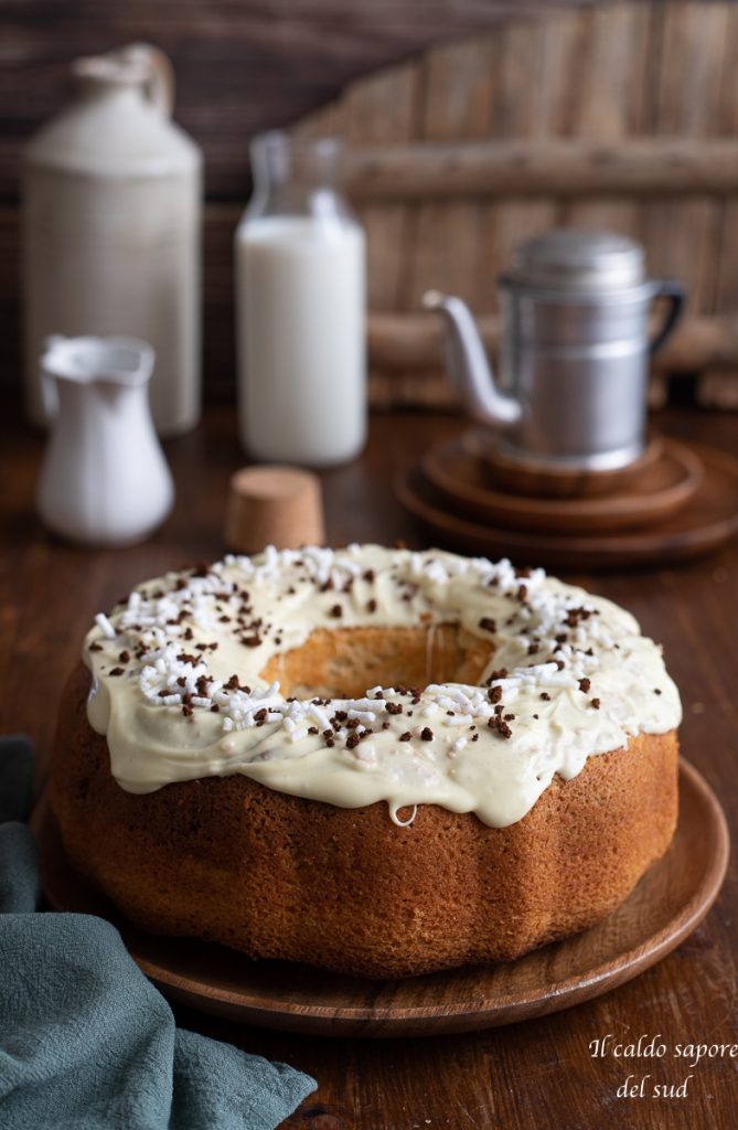 Very soft cappuccino bundt cake with hot milk, the typical grandma’s bundt cake with milk and coffee, super soft and glazed with white chocolate.